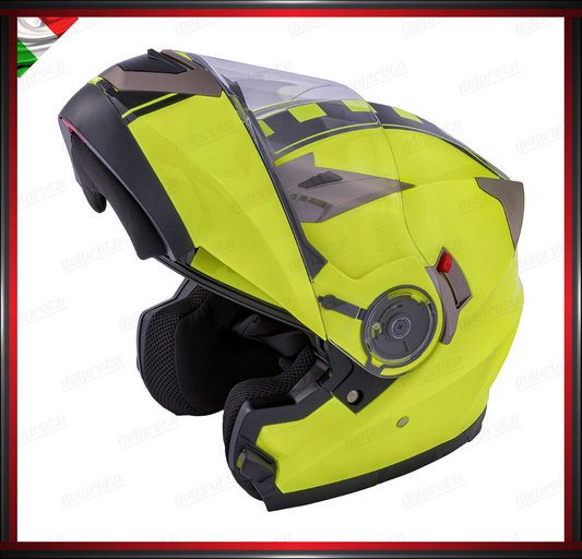 CASCO MODULARE DOPPIA VISIERA APRIBILE FLUO CON GRAFICA OMOLOGATO ECE2205