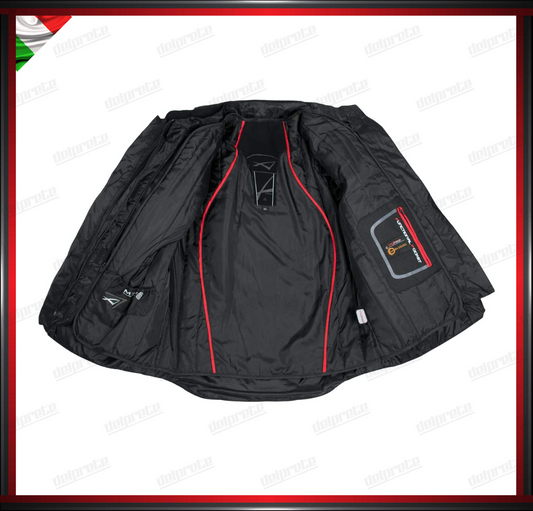 GIACCA MOTO GRIGIO E ROSSO IN TESSUTO IMPERMEABILE FODERA TERMICA REMOVIBILE PROTEZIONI OMOLOGATE CE
