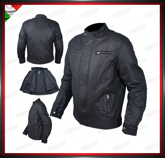 GIACCA MOTO SCOOTER IN COTONE CERATO NERO CON PROTEZIONI E FODERA TERMICA REMOVIBILE