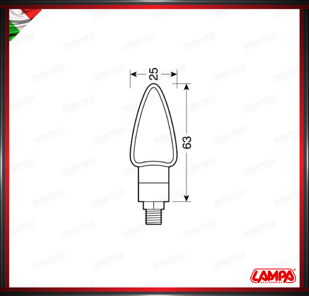 Omologazione. Lente bianca e luce arancione. Sporgenza 6,5 cm con snodo gommato antirottura. Alimentazione 12V. Alta resistenza alle vibrazioni.