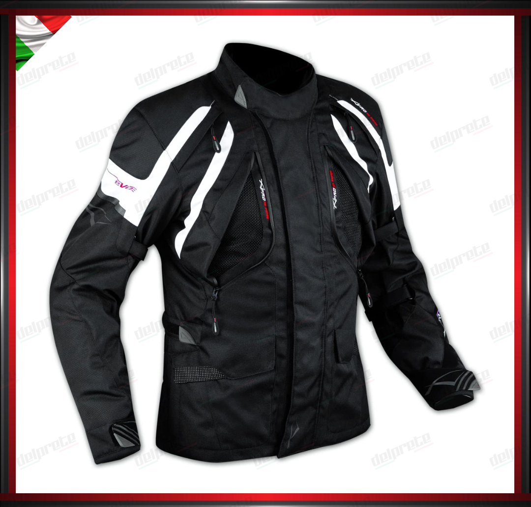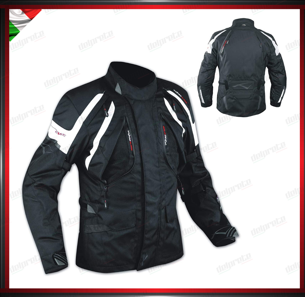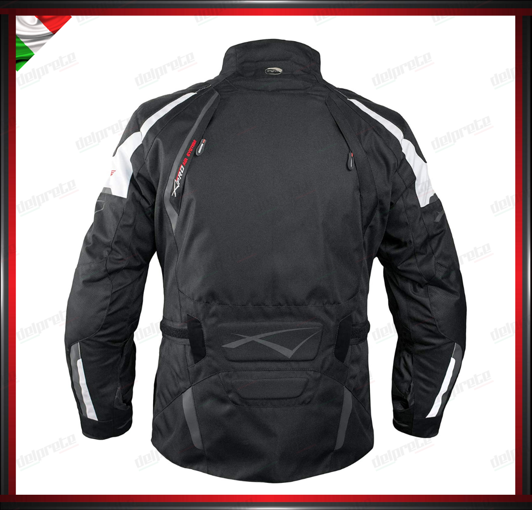 GIACCA MOTO NERO E BIANCO IN TESSUTO IMPERMEABILE FODERA TERMICA REMOVIBILE PROTEZIONI OMOLOGATE CE