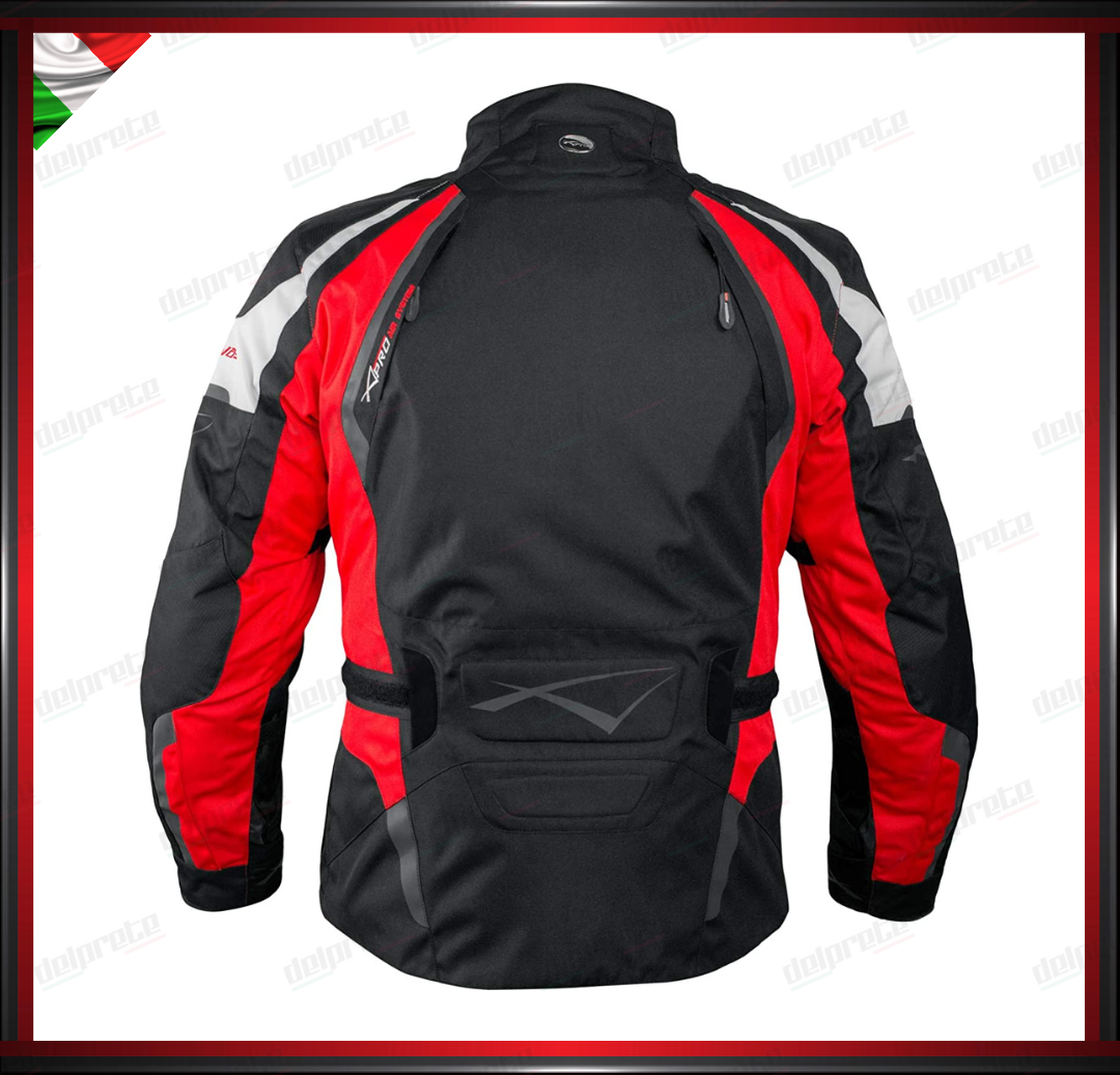 GIACCA MOTO NERO E ROSSO IN TESSUTO IMPERMEABILE FODERA TERMICA REMOVIBILE PROTEZIONI OMOLOGATE CE