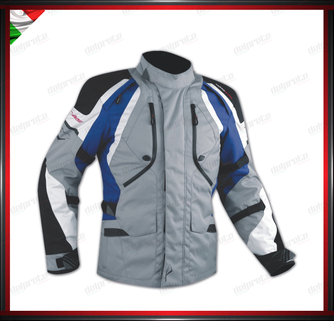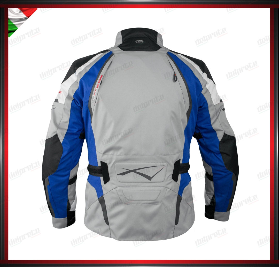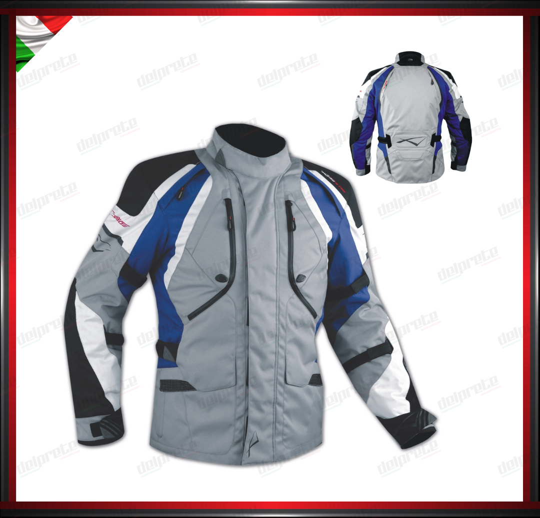 GIACCA MOTO GRIGIO E BLU IN TESSUTO IMPERMEABILE FODERA TERMICA REMOVIBILE PROTEZIONI OMOLOGATE CE
