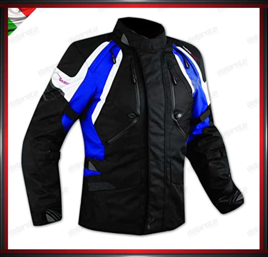 GIACCA MOTO NERO E BLU IN TESSUTO IMPERMEABILE FODERA TERMICA REMOVIBILE PROTEZIONI OMOLOGATE CE