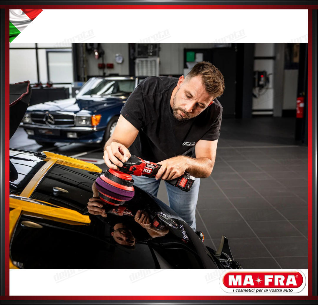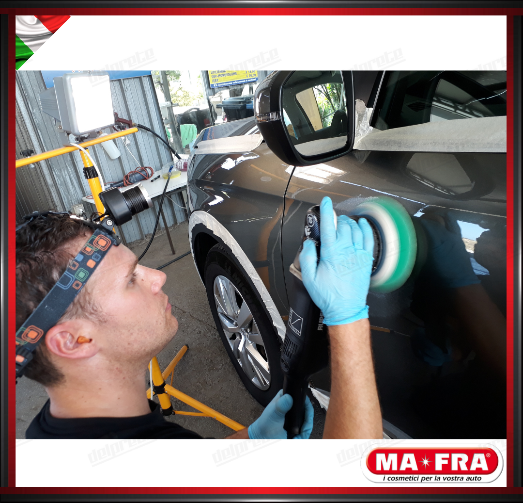 - Con lucidatrice rotorbitale: si consiglia di montare un tampone per paste da rifinitura sulla lucidatrice rotorbitale, versare una adeguata quantità di prodotto direttamente sul tampone, appoggiare la superfice del tampone piatto sulla vernice. Inizia a lucidare usando una moderata pressione ed eseguendo dei movimenti sovrapposti mantenendo il tampone piatto sulla superficie della vernice per tutto il tempo. Lavorare su sezioni di circa 50 cm x 50 cm per volta fino a quanto il prodotto inizia ad essere assorbito.